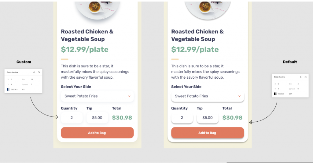 Changing your shadow to a dark version of colors found in the UI really ties the design together and helps it feel cohesive.