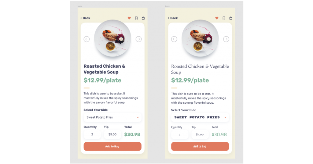 I hinted at this slightly in the section about text hierarchy. Using a font family with multiple weights can really make your designs come to life! A skilled designer can often use one font family for their entire app without making it boring visually! There also might be some situations where you might want to or need to use 2 different font families in one project. When and if you decide to do this, be very careful. Never use more then 2 fonts families. It is best to view one of your fonts as a main font, with the second as an accent. If you do decide to use two font families, it is also best to select one Serif font and one Sans Serif font (This is more of a suggestion, pairing similar style fonts can be done, but is much more challenging).