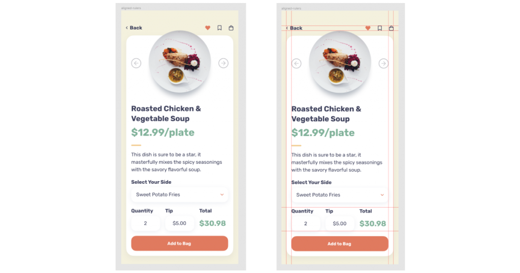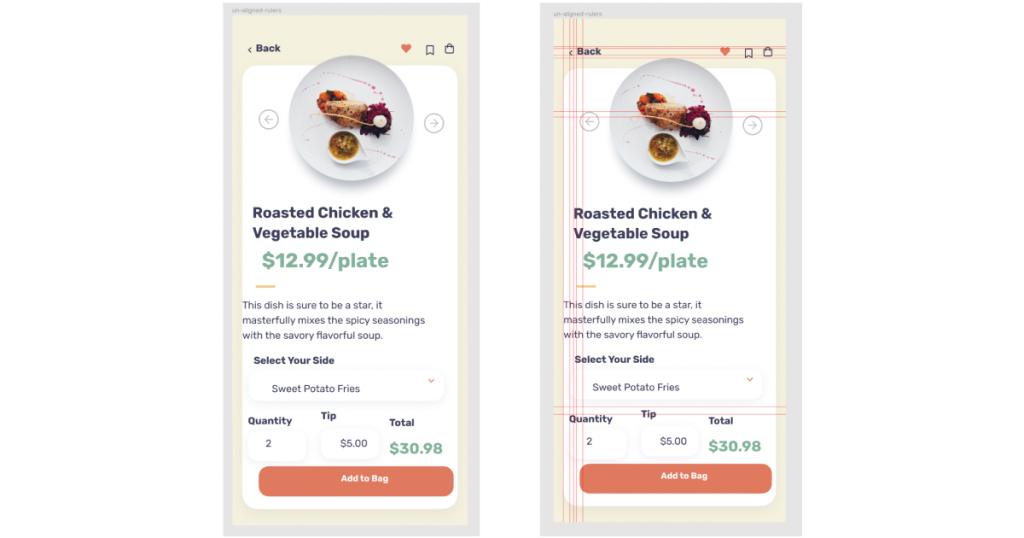 Notice the example below. Despite having clear hierarchy of text, nice colors and clean images, something still just feels off. That is because the alignment is all over the place! True, this might be an extreme example. But I have seen much worse on live apps and websites before, and more often than I would expect in social media posts. The red lines are rulers, and they give you a clear example of where things should be aligned for this design to look polished.