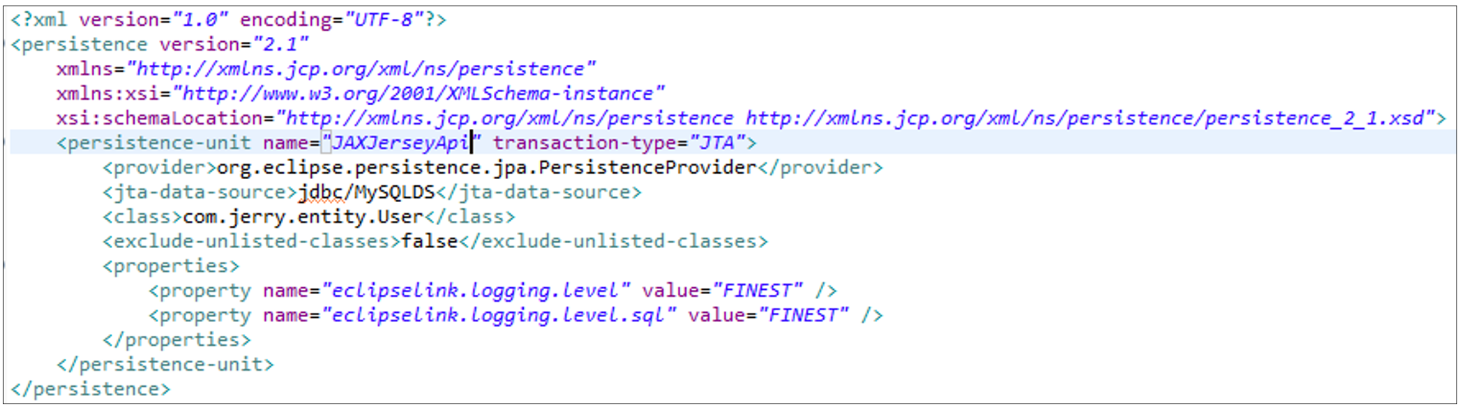 <jta-data-source> Our Datasource name, previously configured in Glassfish Containe
