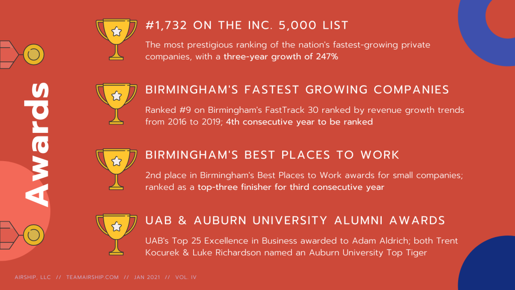 - Auburn University’s Top Tiger Awards: Awards presented to Airship’s Trent Kocurek, CEO and Co-founder, and Luke Richardson, VP and Lead Opportunity Explorer; awards and rankings for 2020 were postponed until 2021, but this is our 3rd time to be on the list and ranked 2nd place in 2019 and 1st place in 2018 *chef’s kiss*