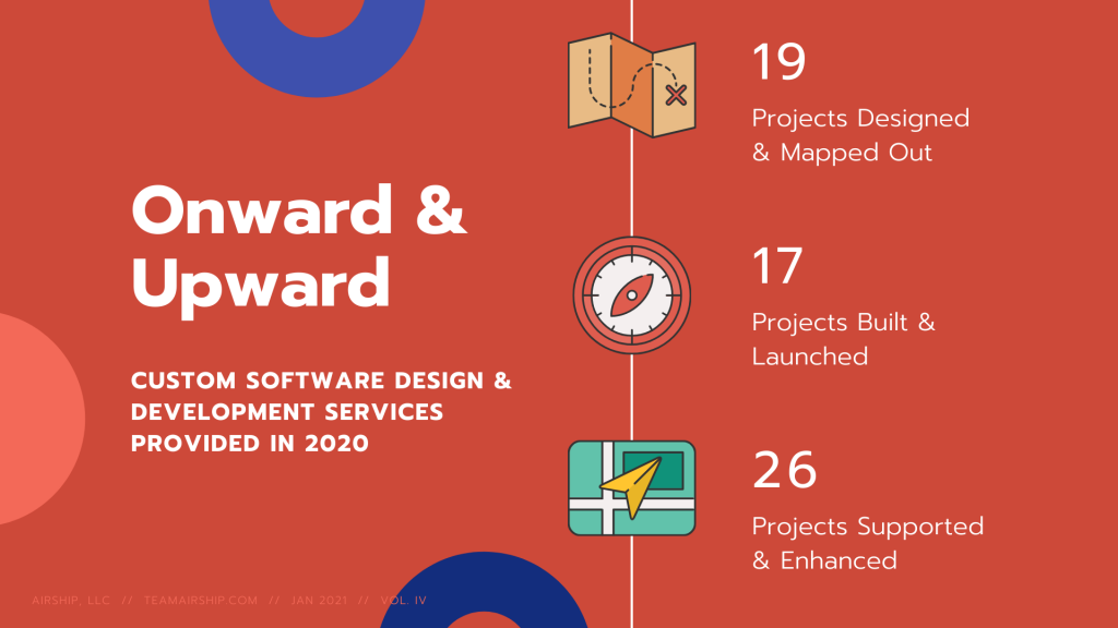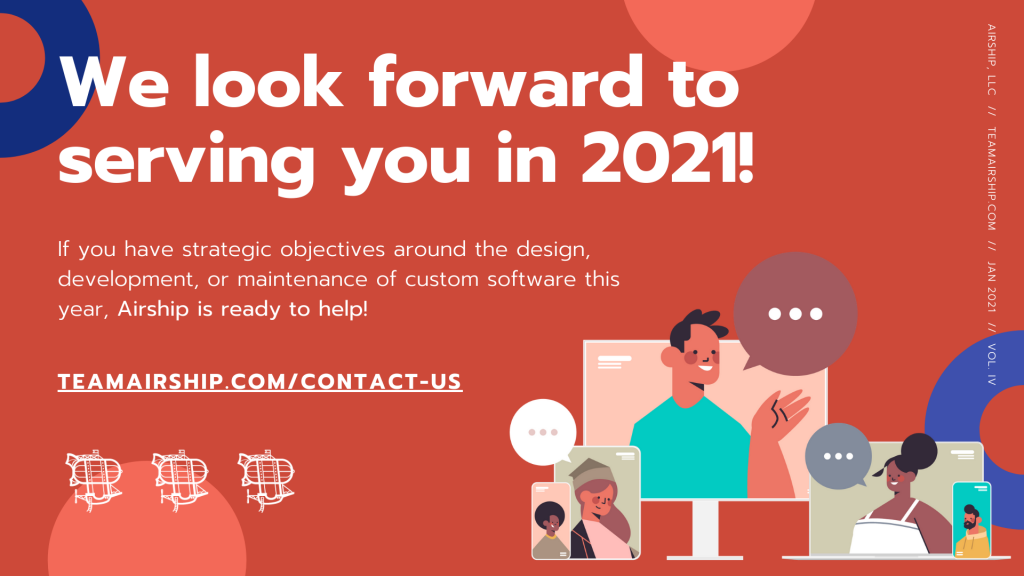 It was a very interesting year for designing, developing, and maintaining custom software applications at Airship. We saw many clients, new and returning, moving to remote work and exploring new ways to pivot in 2020 for their customers. Entrepreneurs, too, were looking for MVP solutions and prototypes. Overall, it was a great year for innovative technologies.