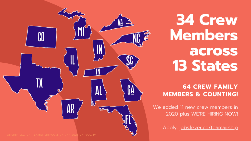 Our remote-first company has grown by adding 11 new crew members across 13 states since 2020, making our total number of employees 34 as we enter 2021.