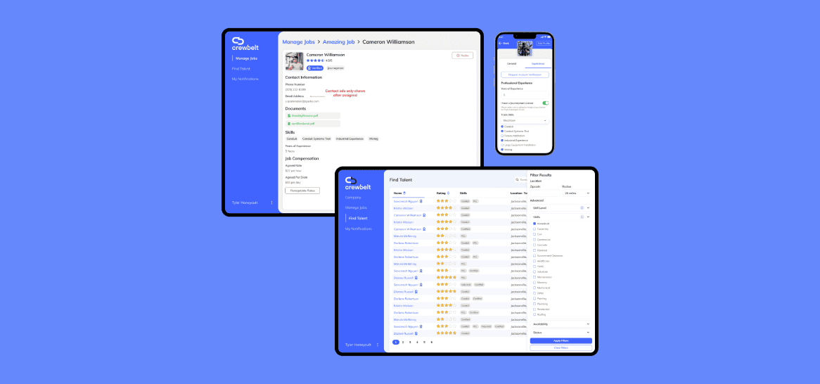 CrewBelt is a platform built for Trades Companies to manage jobs for their organization, covering a full workflow from posting jobs, negotiating rates, and handling payment and taxes.