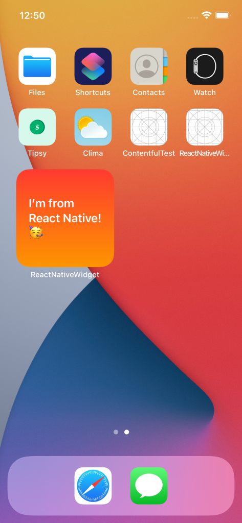 You now have a widget running off of a React Native application that can send info to update after a set time. This starting point should allow you to push and test what you can do. I was able to archive and sign the app with an adHoc profile which allowed me to install it on my own phone to play around with. Being able to run it without Xcode on my physical device, proved that this could potentially be used in production with enough testing.