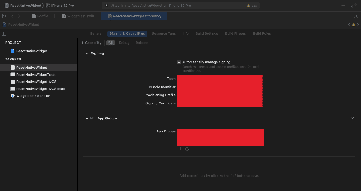 First thing we need to do is setup our App Groups so data can be shared from the React Native app and the widget extension. Click the main target,