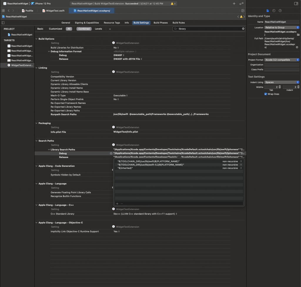 protocol. The files associated with it are written in Swift, and the display for the widget is created with SwiftUI. The downside to having the widget extension attached to the React Native app, is that the SwiftUI preview in Xcode has not worked for me during development. Native apps don’t have this issue, just when running it with a React Native app. It is not a deal breaker, since you can just re-build the widget after changes are made. Widgets are small, so not a bad wait time!