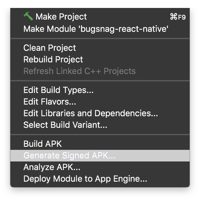 The sign_apk will take in a keystore file and attach it to our apk file to tell Google Play that it’s valid. Where do you get a keystore file? Open up Android Studio, navigate to your Android project, and then click this option under the Build menu: