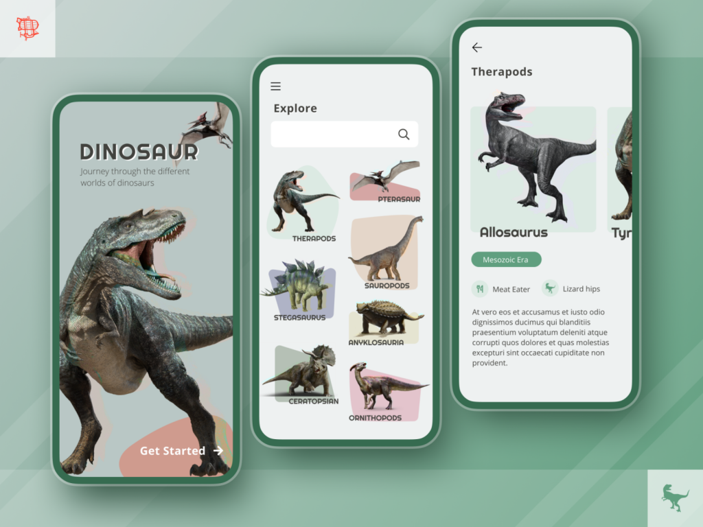 Here is a design exercise for a fun app that organizes dinosaurs in similar groups! The design allows a user to tap on a dinosaur type, and within that type scroll left and right to see similar dinosaurs.